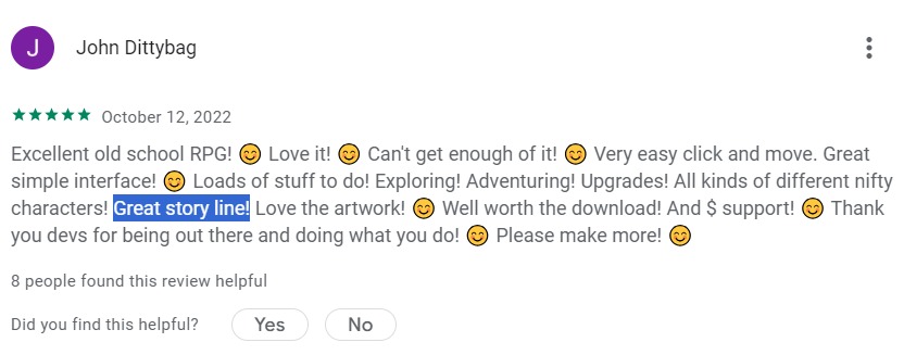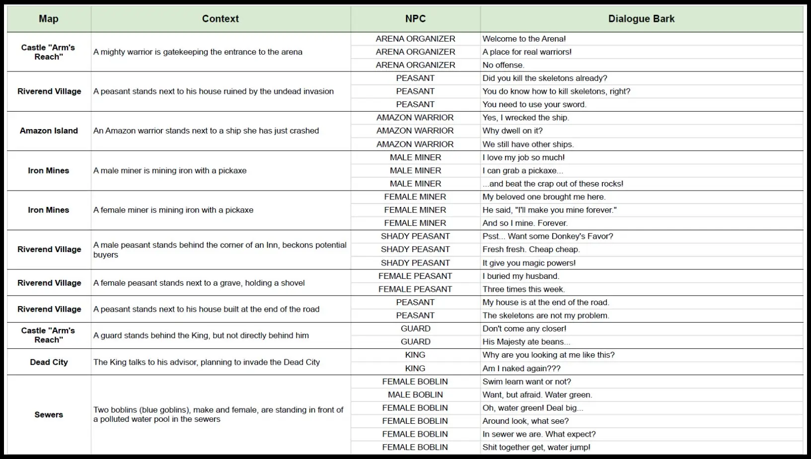 I wrote NPC barks for over 200 characters across 5 story campaigns. They occur when the player repeatedly taps an NPC. Every tap plays the next line in the loop. This allowed me to create sequences of lines, rewarding them with funny quips, personal NPC stories, or anecdotes that reflect on the game’s world.