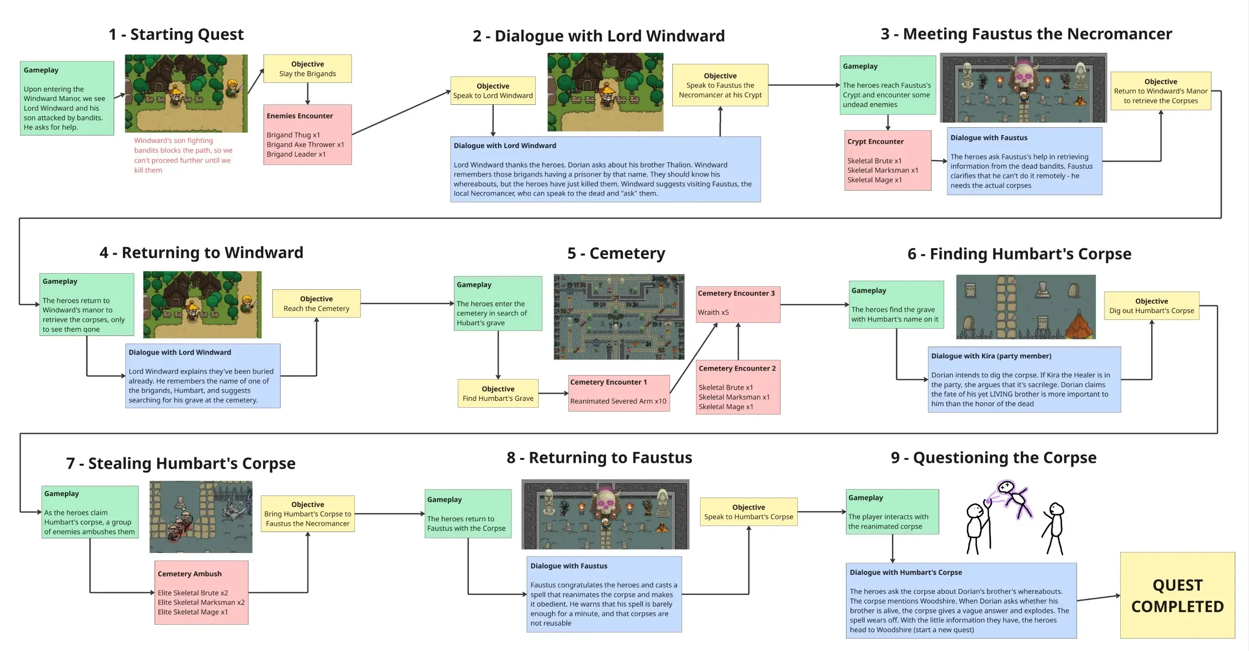 Once the outline was approved, I started the design process. My first step was to lay out the quest’s flow: