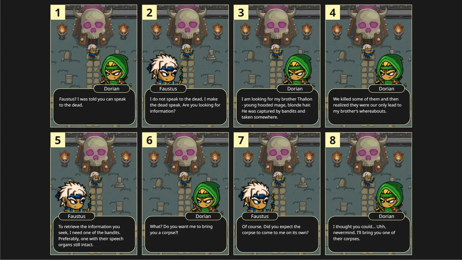 Faustus already existed as a playable character, but he had no connection to the story. Based on Faustus’s design and abilities, I gave him a personality and a backstory, and came up with a quest idea that fits the story.