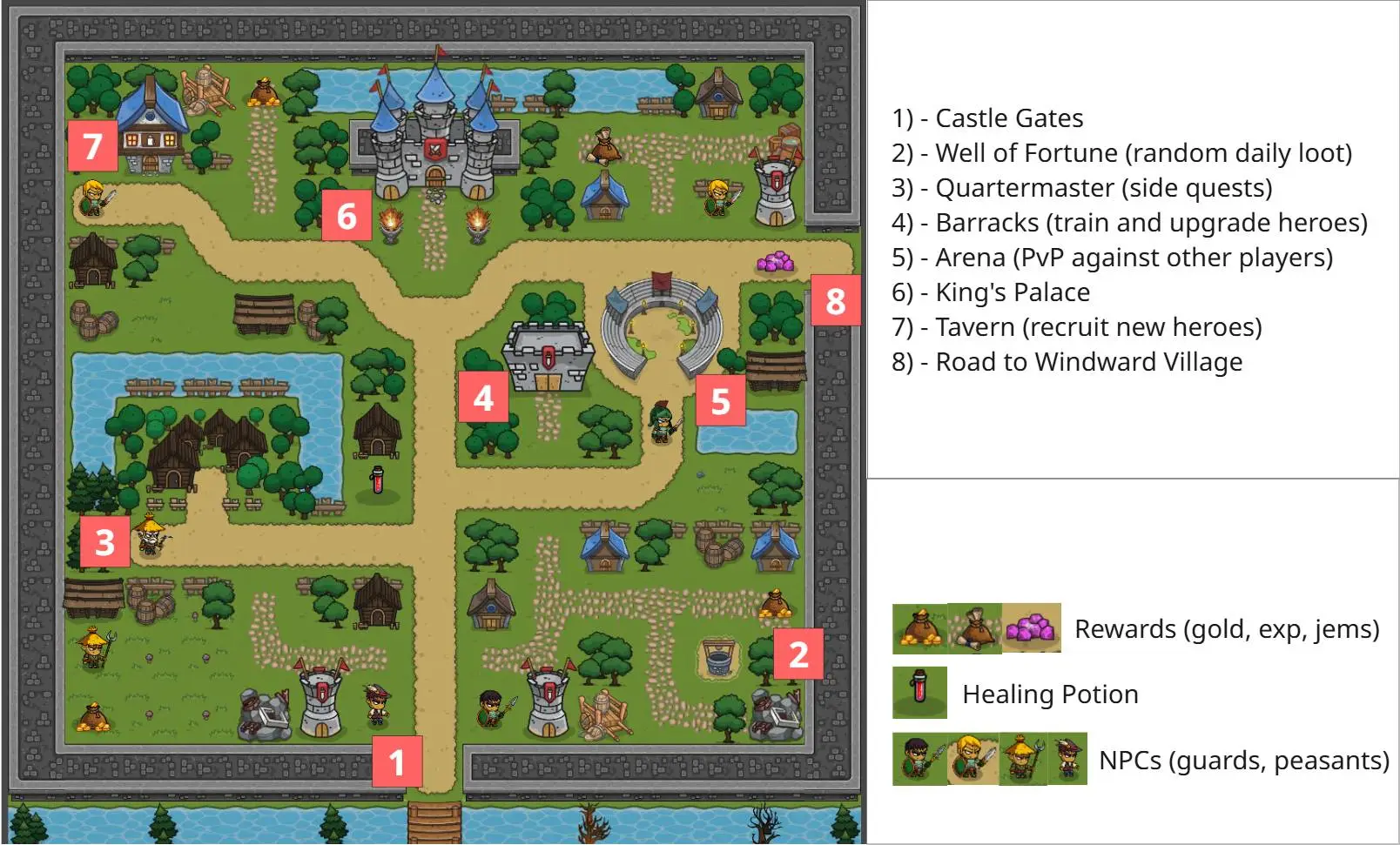 Designed the player’s home base. Players visit this area whenever they go “home” from the campaign map. Here, they can recruit new heroes, upgrade their gear, join PVP arenas, take side quests, and fish for loot.