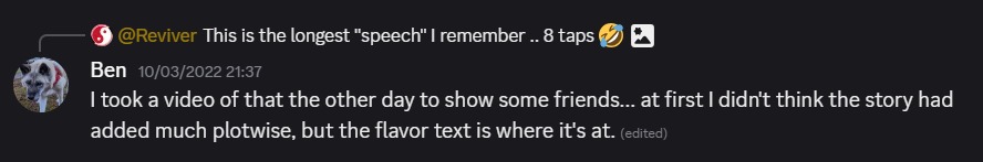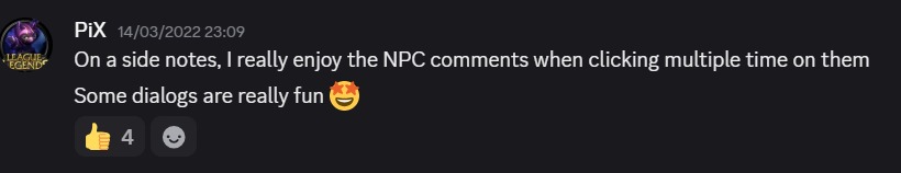 Additional Perspective The NPC lines add something to the lore, and/or give the player hints about secrets and easter eggs.
