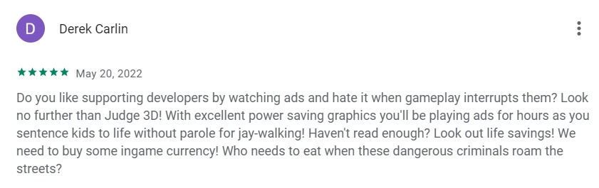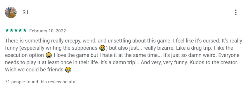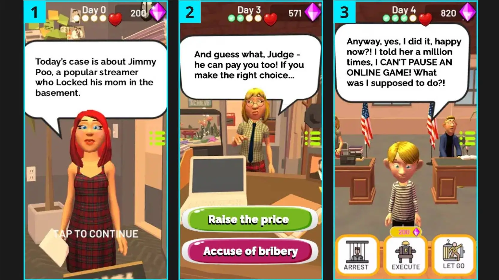 Judge 3D is a narrative-driven hyper-casual game by Crazy Labs. You play as a judge to bring your verdict based on the information presented to you. The accused will attempt to lie, bribe, and even threaten you.