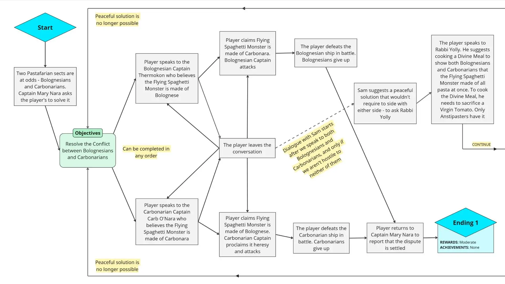 I went for a branching where the player may or may not use violence to complete the quest. Each choice has its consequences both in the story and gameplay. So I drafted an outline to lay out the quest’s high-level story.