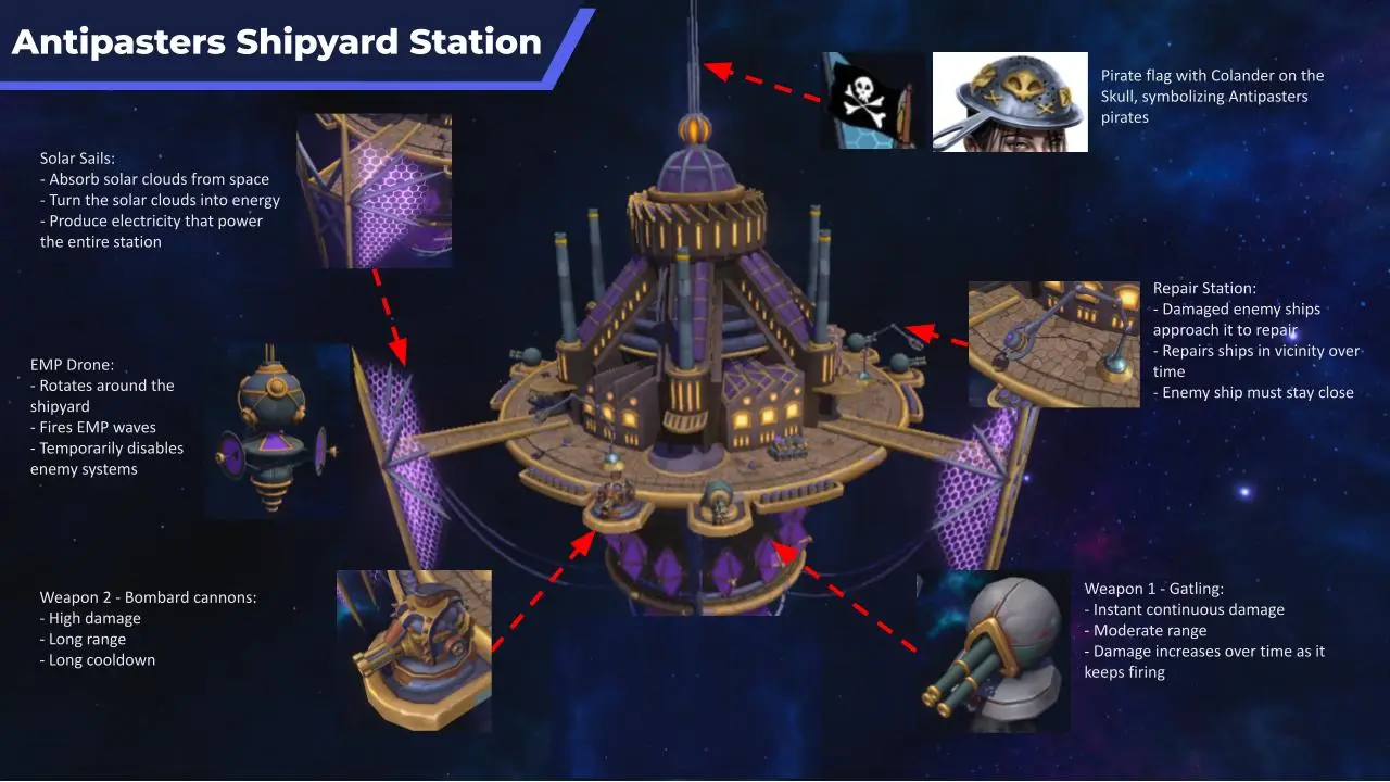 Designed buildings in the space pirate hub. They are all structures built upon asteroids or artificial platforms floating in space. When designing buildings, I emphasized the following: