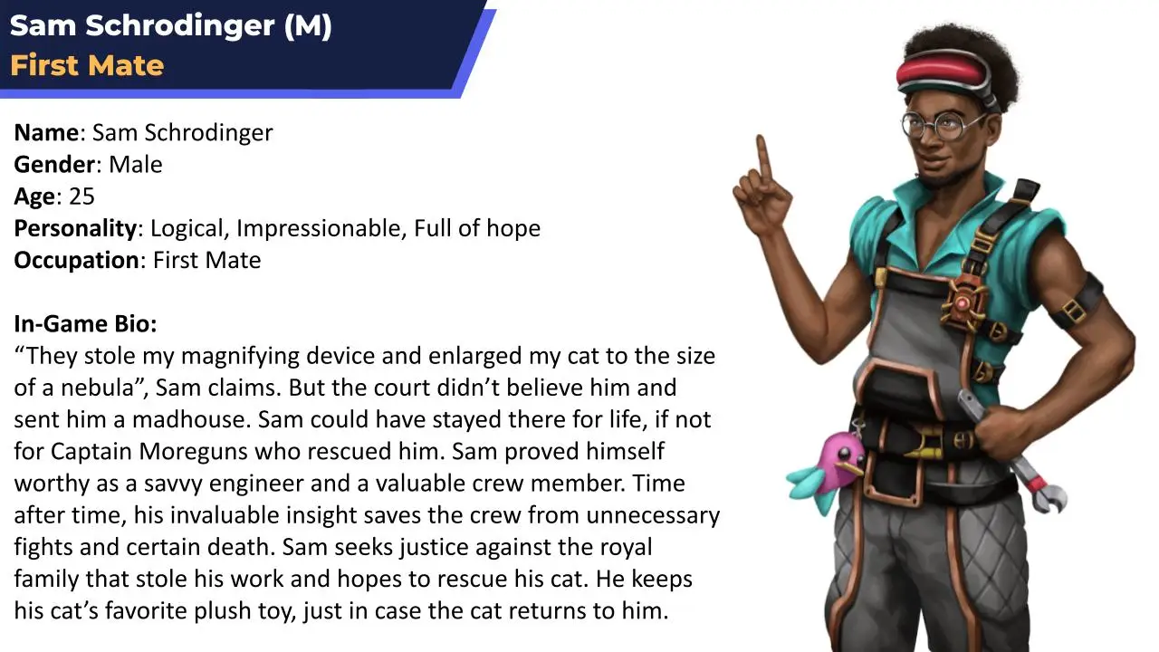 Sam is a crew member who can be trained for a specialization: steering, combat, support, or maintenance. He is nerdish and awkward, inspired by Steve Urkel from Family Matters. And also absurd – a person who is all about logic and science, believes he can find a cat in a galaxy that stretches light-years across. This is improbable. And yet…