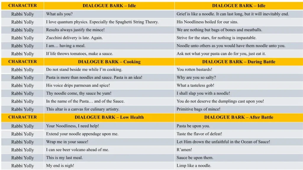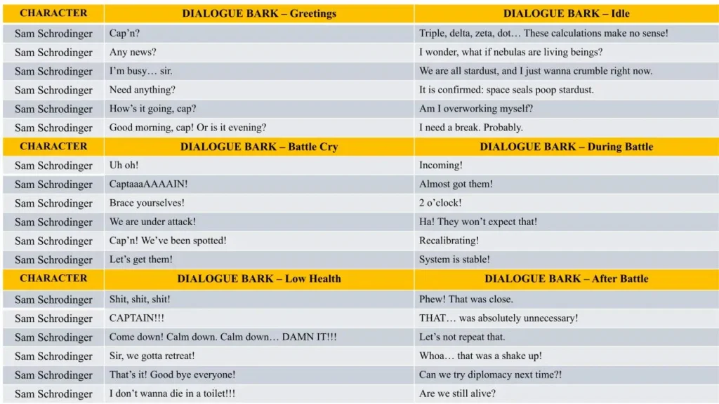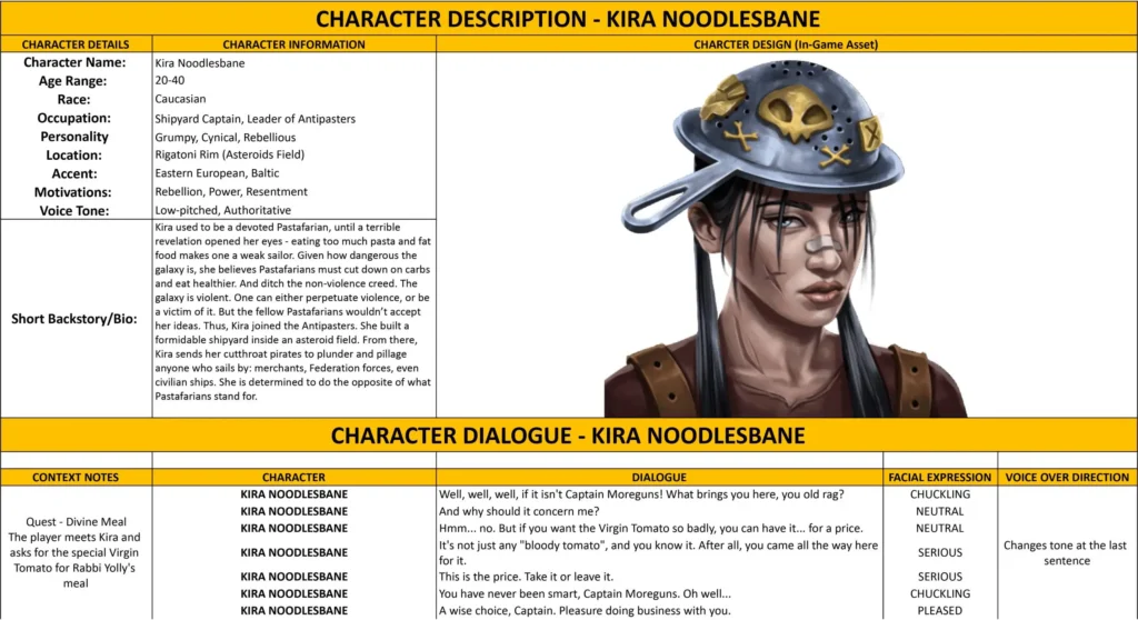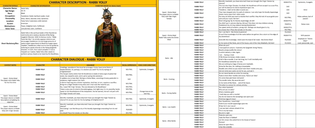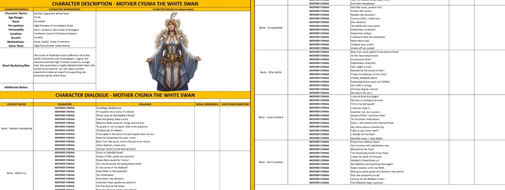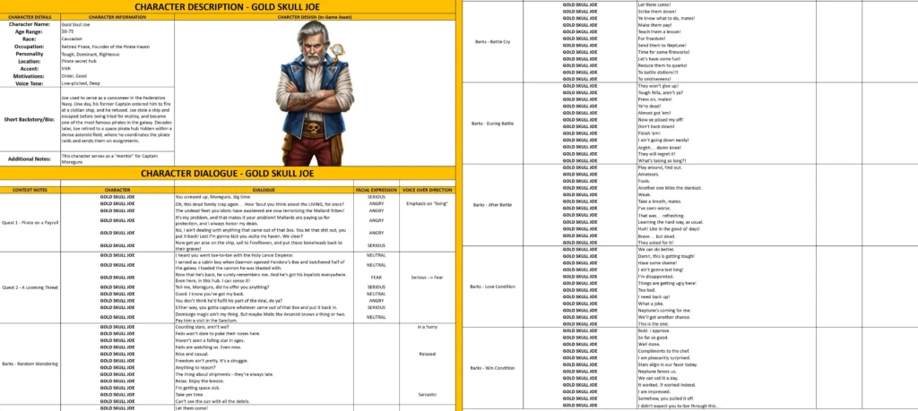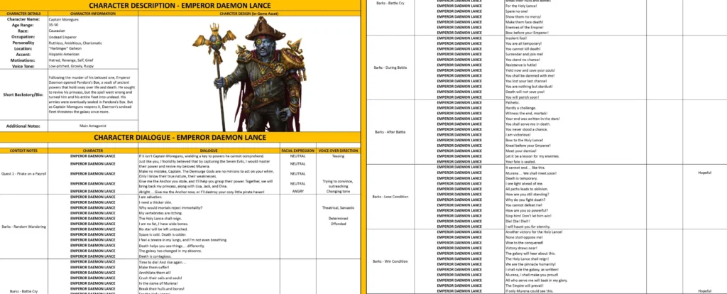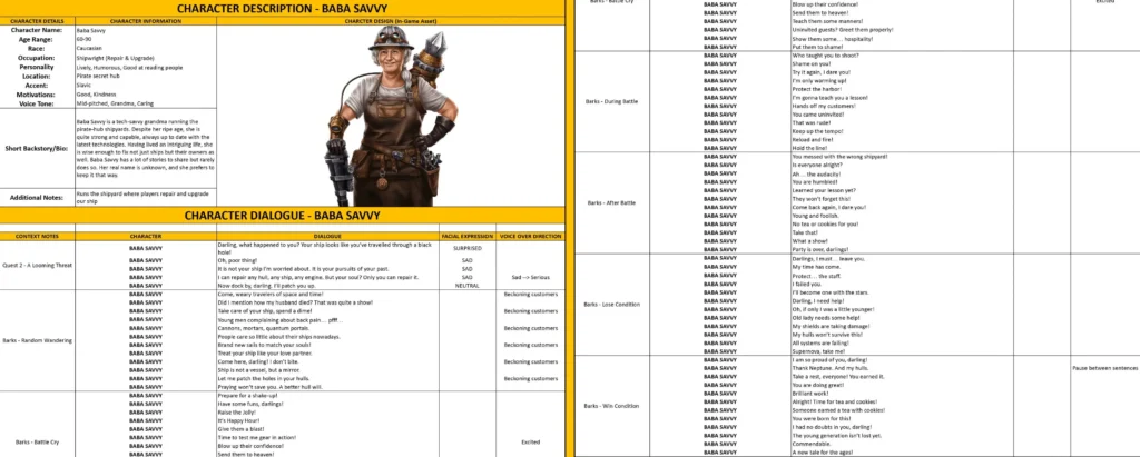- Dialogue Lines and Barks – the character’s lines, including context, mood, and voice direction.