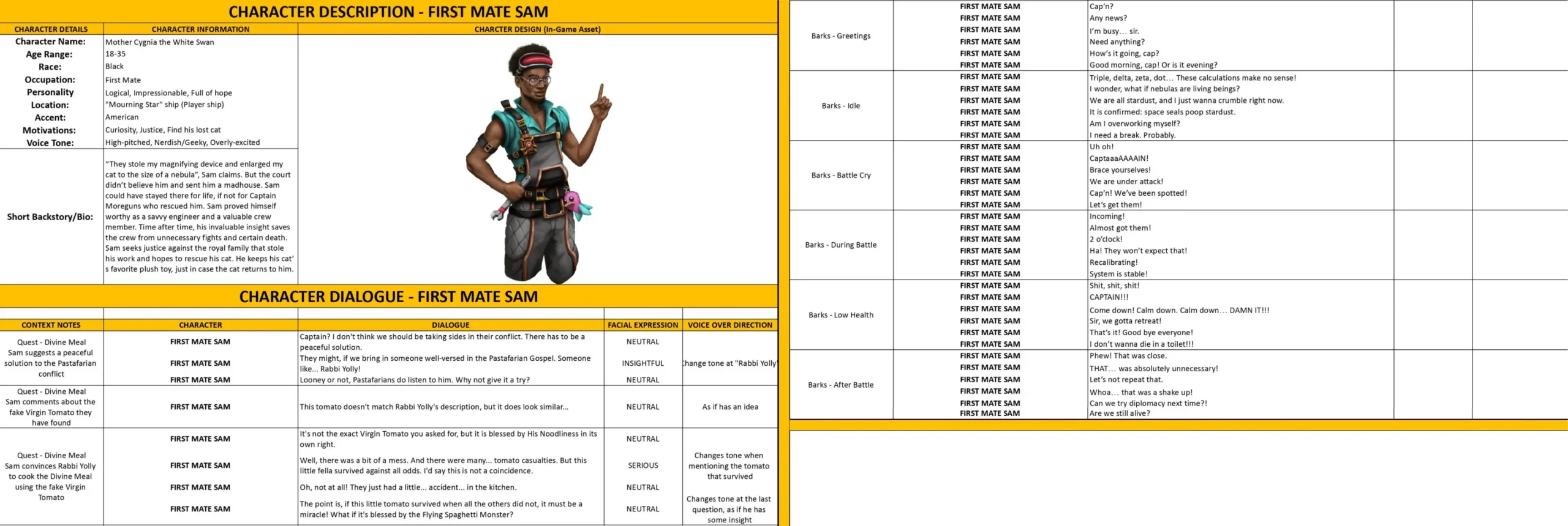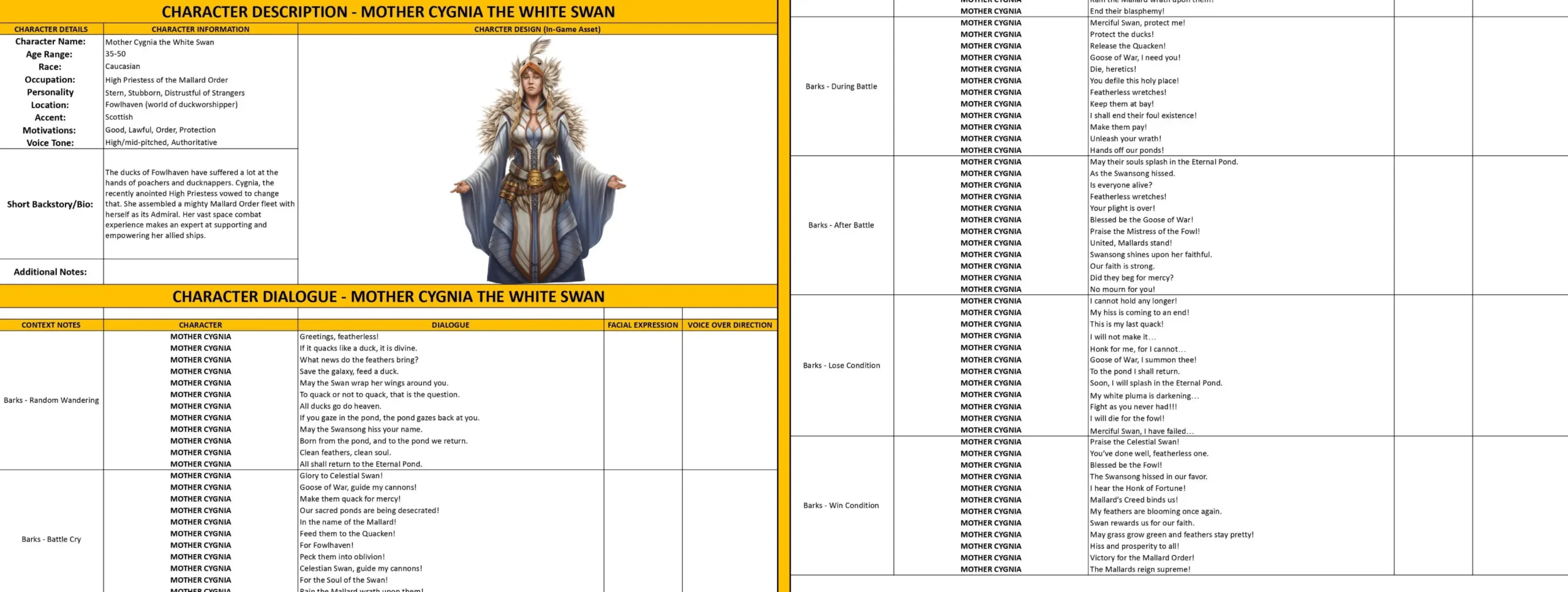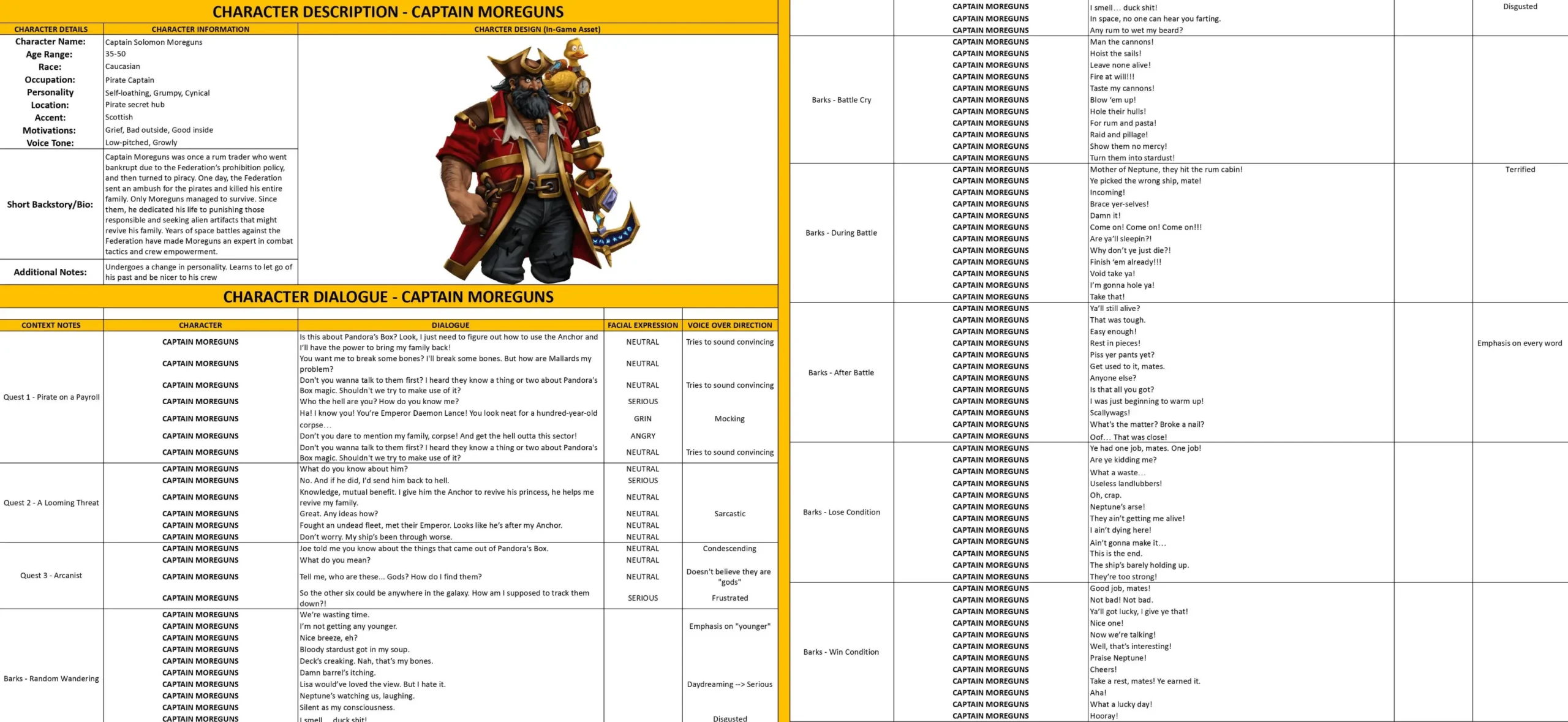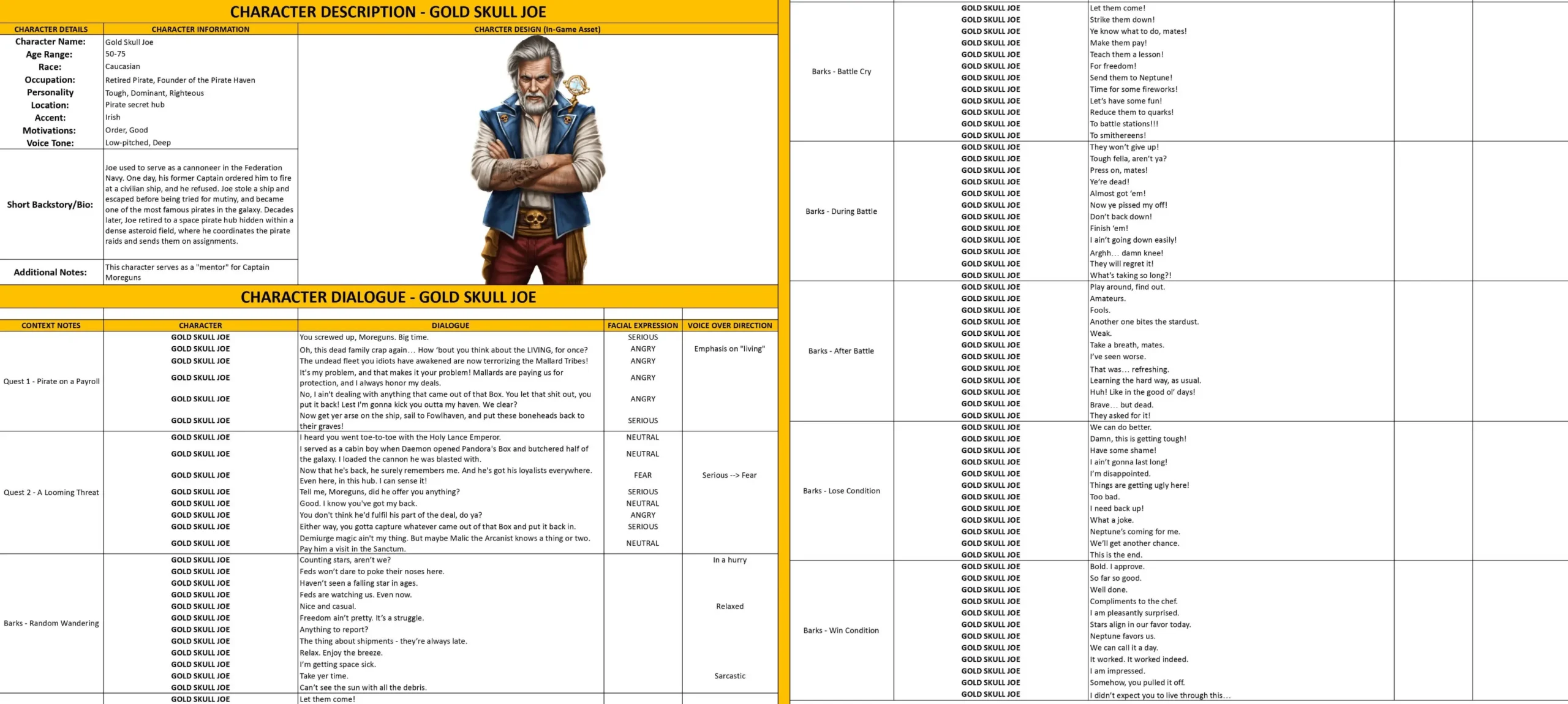 - Dialogue Lines and Barks – the character’s lines, including context, mood, and voice direction.