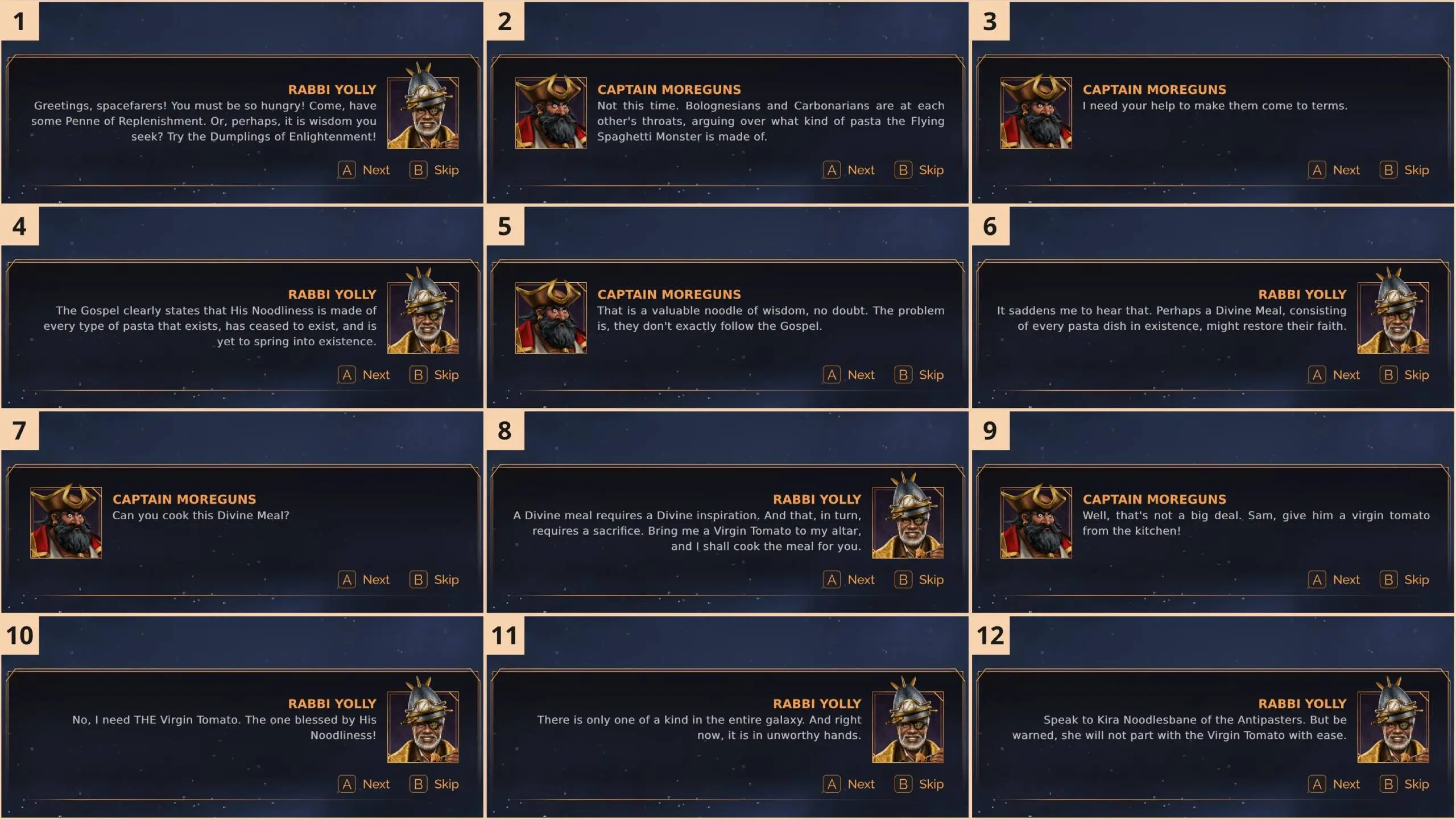 The player must stop the conflict between two Pastafarian sub-factions, Bolognesians and Carbonarians. They fight over what pasta the Flying Spaghetti Monster is made of: Bolognese or Carbonara.