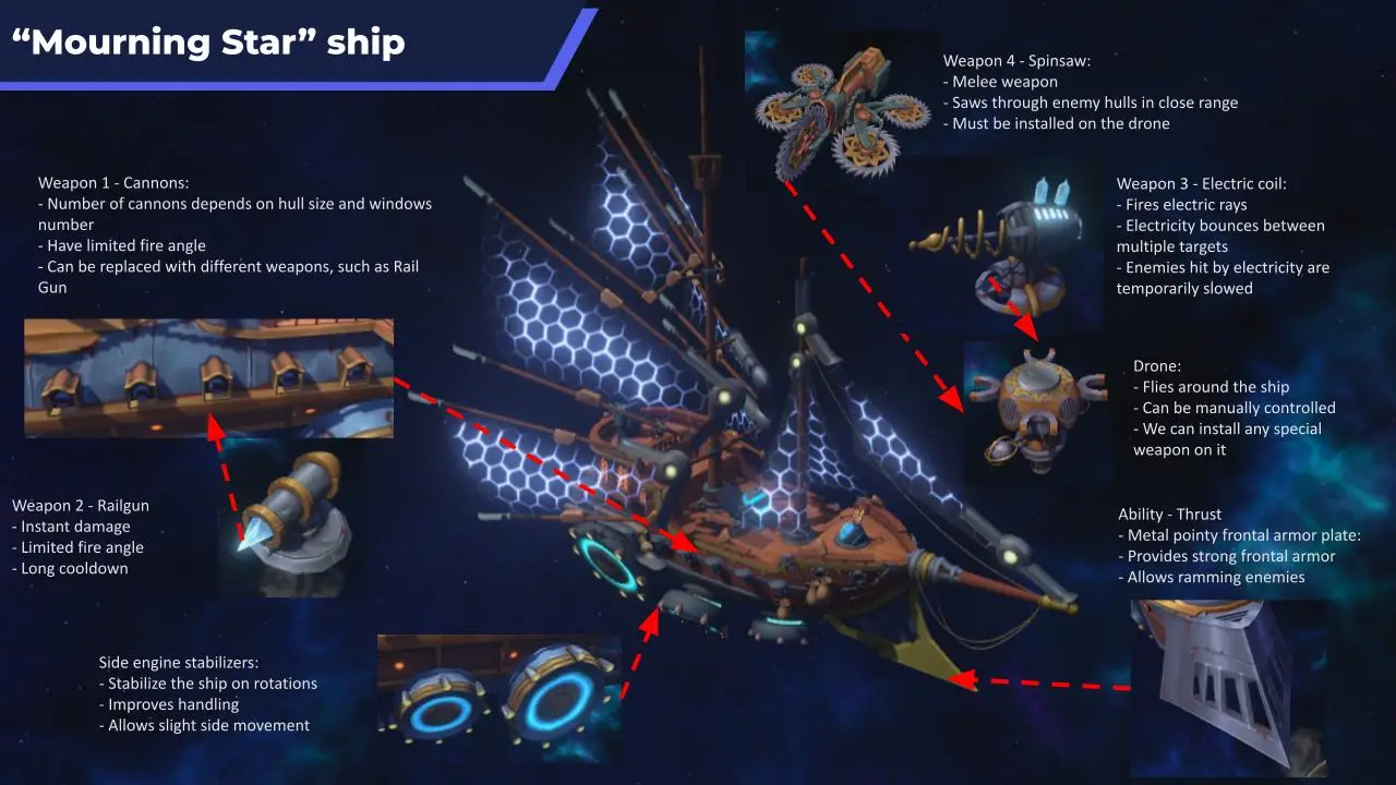 I designed the map for the Pirate Hub, which serves as a home base for players. Here, they can interact with vendors, upgrade their ships, and talk to NPCs to start new quests. This isn’t the full map, just a sketch to show the basic layout. I based the positions of each vendor on how I want players to prioritize them. Frequently visited vendors are closer to the top center part.