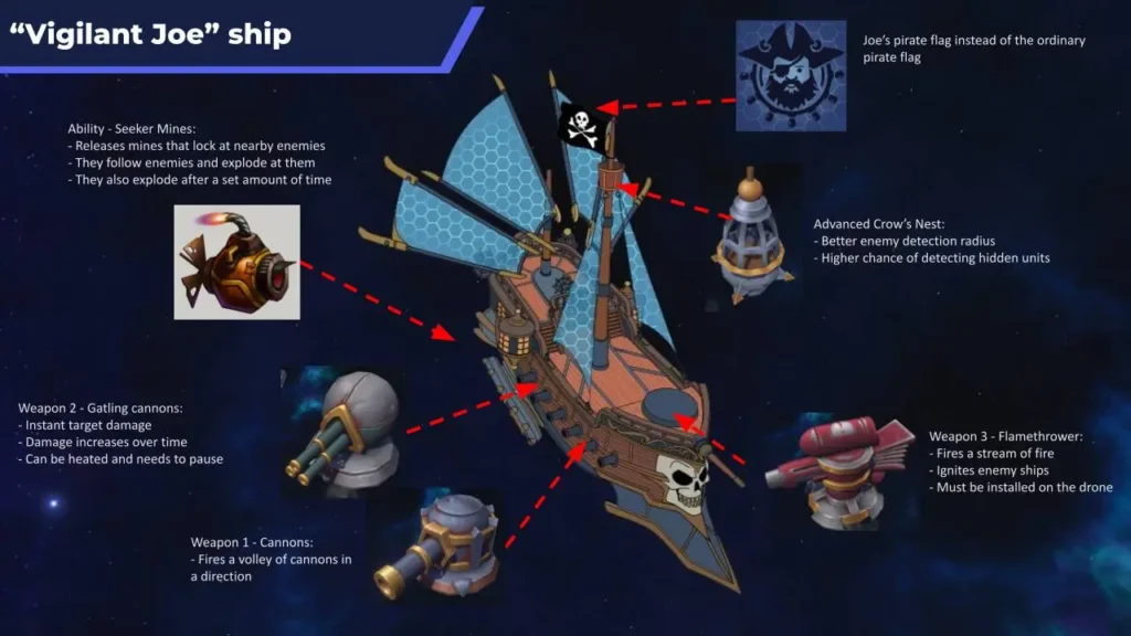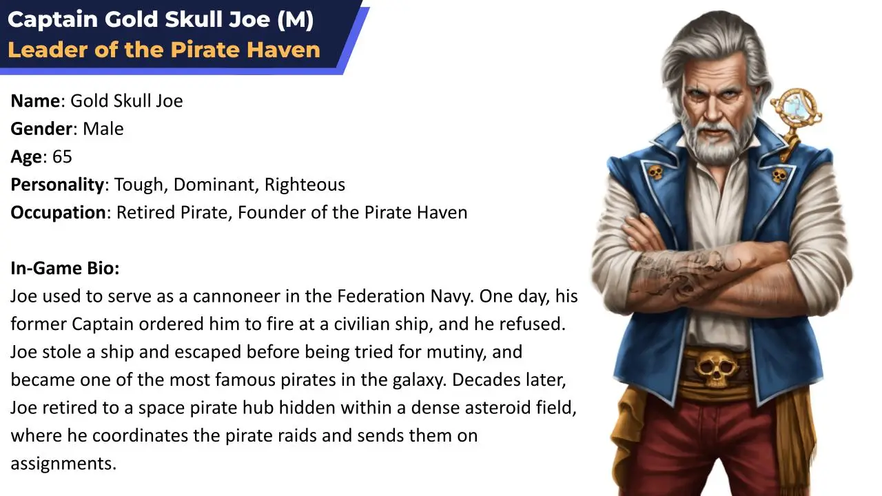 I find Gold Skull Joe particularly interesting because I believe the game’s piracy setting has a place for a strong mentor with strong principles. Besides being a quest giver, he also has a combat ship, which serves as an ally unit against enemies.
