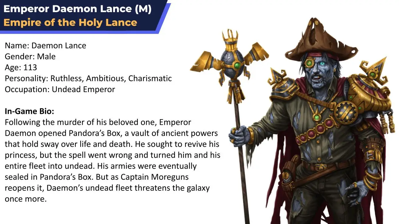 Emperor Daemon Lance is the antagonist in the game. Like the main character, he also fails to cope with grief over the loss of his loved ones. He seeks the same ancient artifacts to bring them back to life. But his means of are more ruthless.