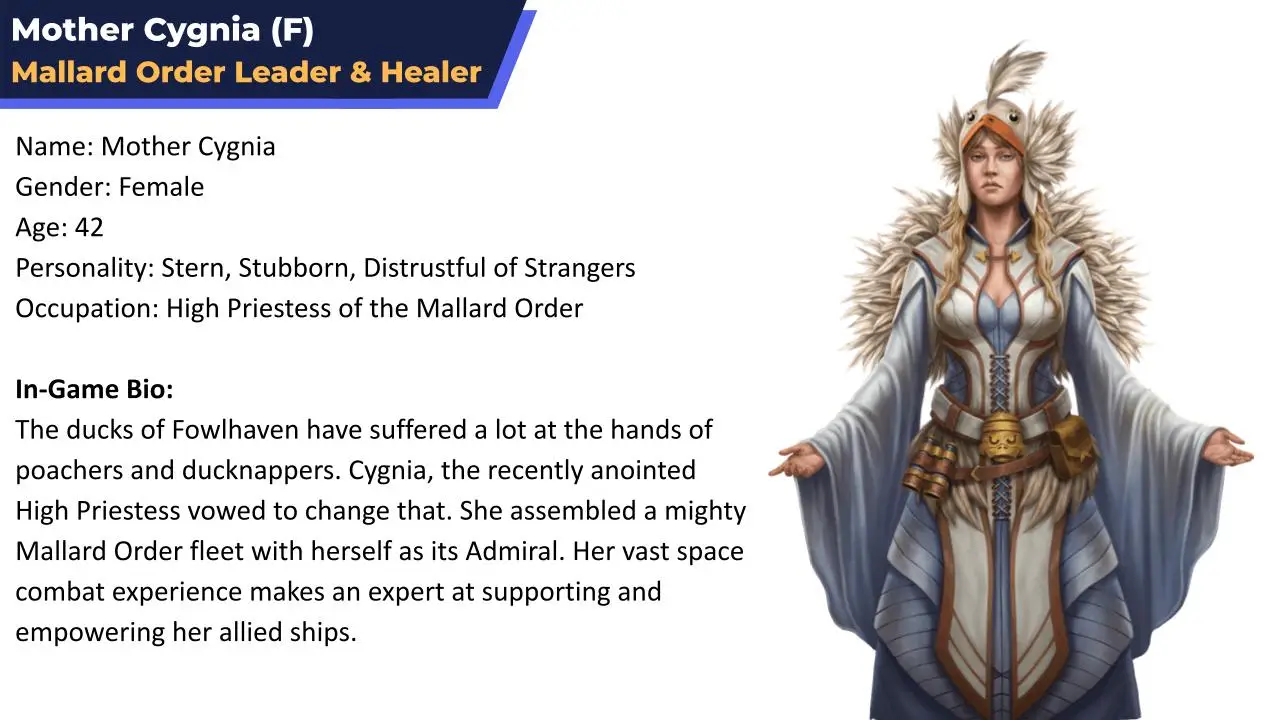 Cygnia leads the Mallard Order, a religious space society that worships ducks. Completing quests for her grants access to high-tier quests and ship gear.