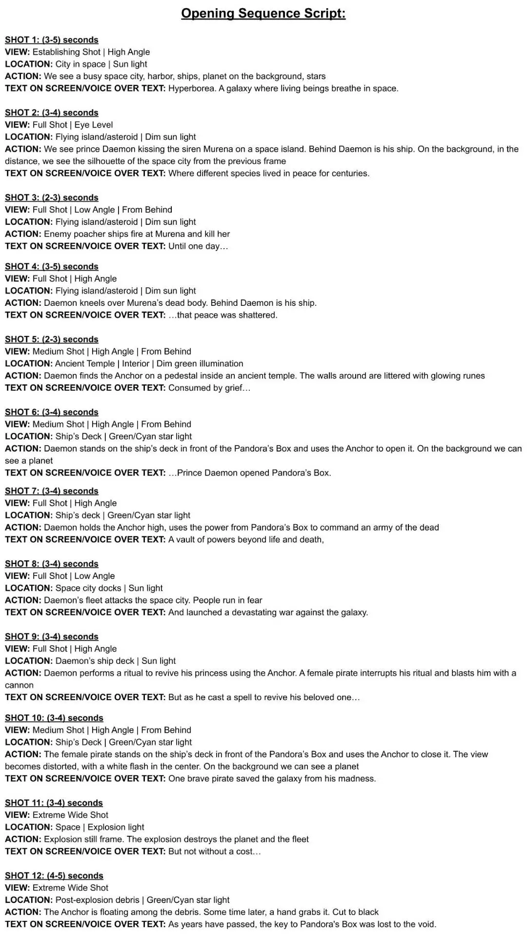 - Described the shots with specific camera angles, locations, and their composition.