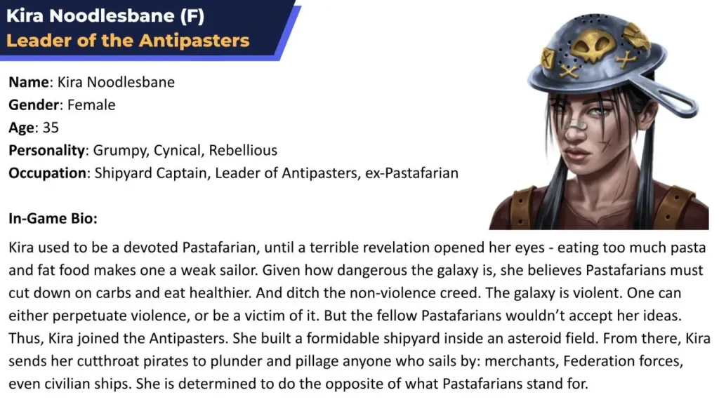 Kira Noodlesbane can be an enemy or an ally (later in the game), depending on the player’s choices. She runs a shipyard protected by automatic defenses and a pirate fleet. When writing this character, I took inspiration from Gamora from the MCU and Kitana from Mortal Kombat. She serves as a counterweight to the carefree lifestyle of the Pastafarians.