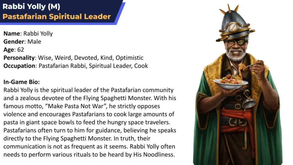 Rabbi Yolly starts as an ally who guides the player and later joins as a crew member with non-violent support abilities. When writing this character, I was inspired by the God character from “Bruce Almighty” and by Mr. Miyagi from “The Karate Kid” films. The idea was to create a wise but silly mentor who lives carefree and enjoys the simple things in life.