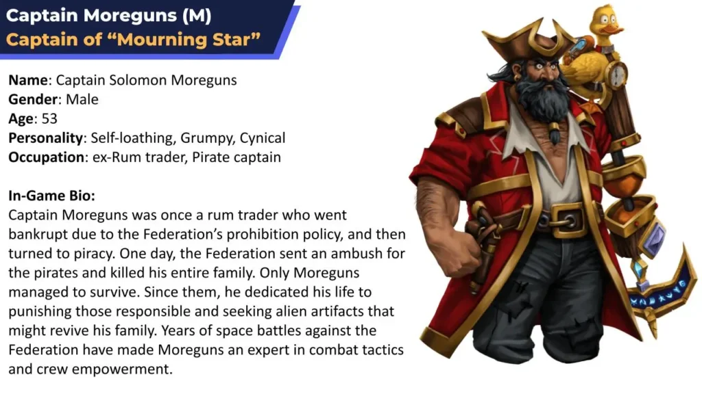 I find Captain Moreguns an interesting character because he is an “Anti-Hero”. Initially, he is cynical, self-centered, and lacks heroic qualities. But as his journey progresses, he discovers the good in himself and becomes more altruistic.