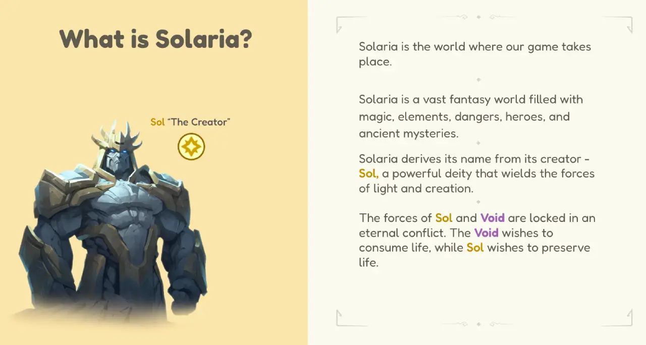 My work was finally approved! My document became the “source of truth.” The studio published the game’s lore in a presentation format. I did NOT make the presentation. I’m only responsible for the lore content.