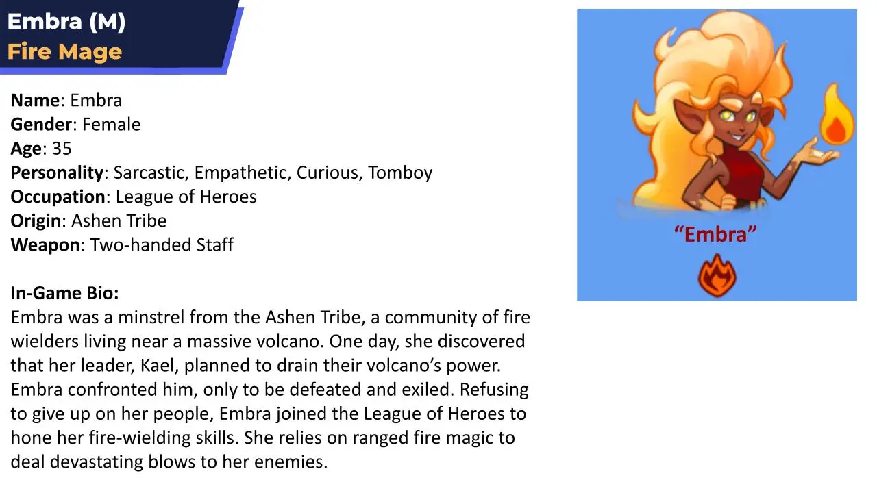 Embra is a fire mage with ranged attacks that deal area-of-effect damage.