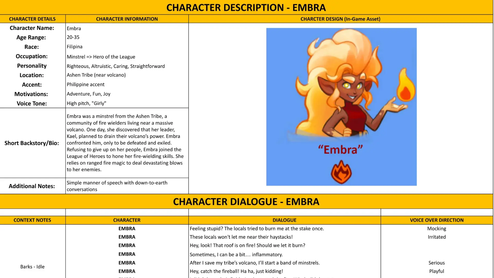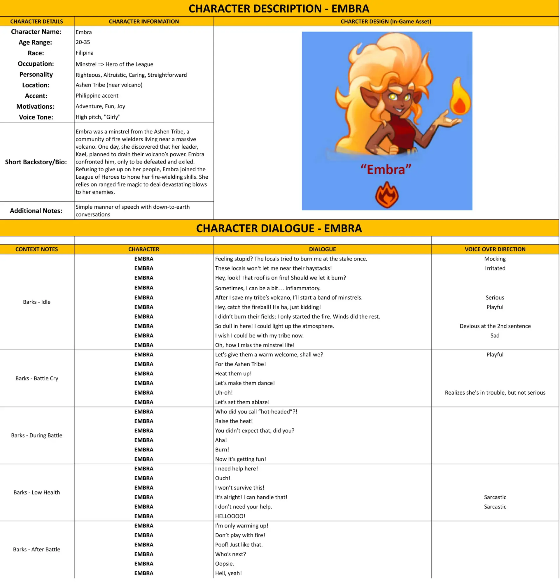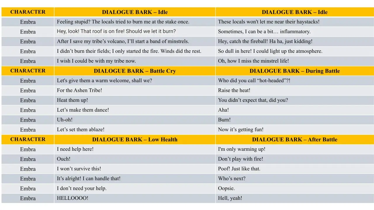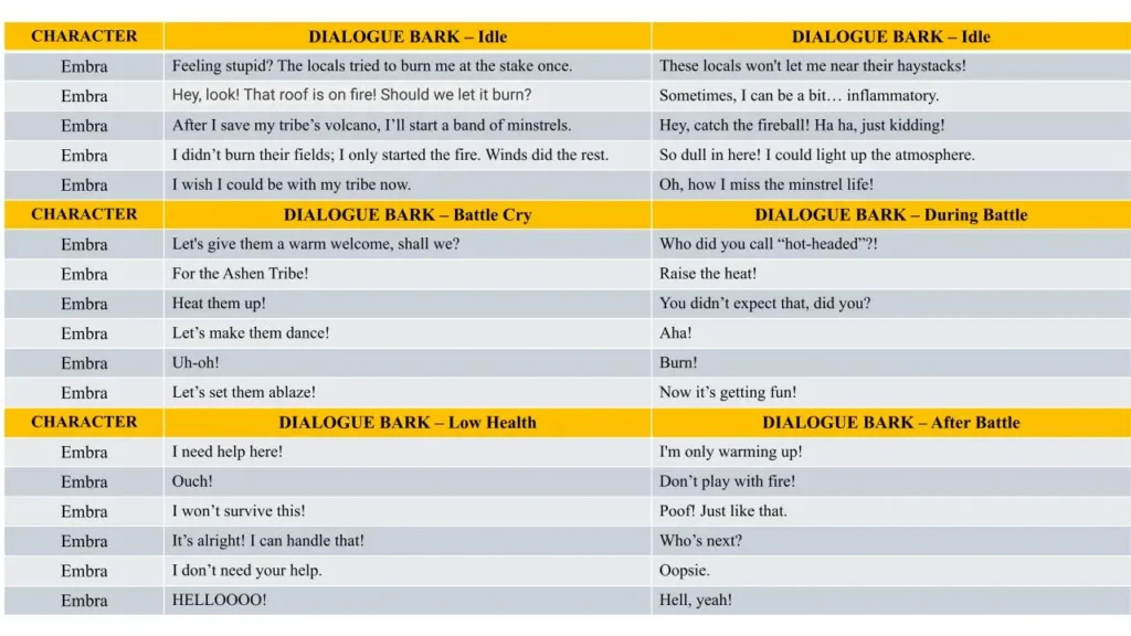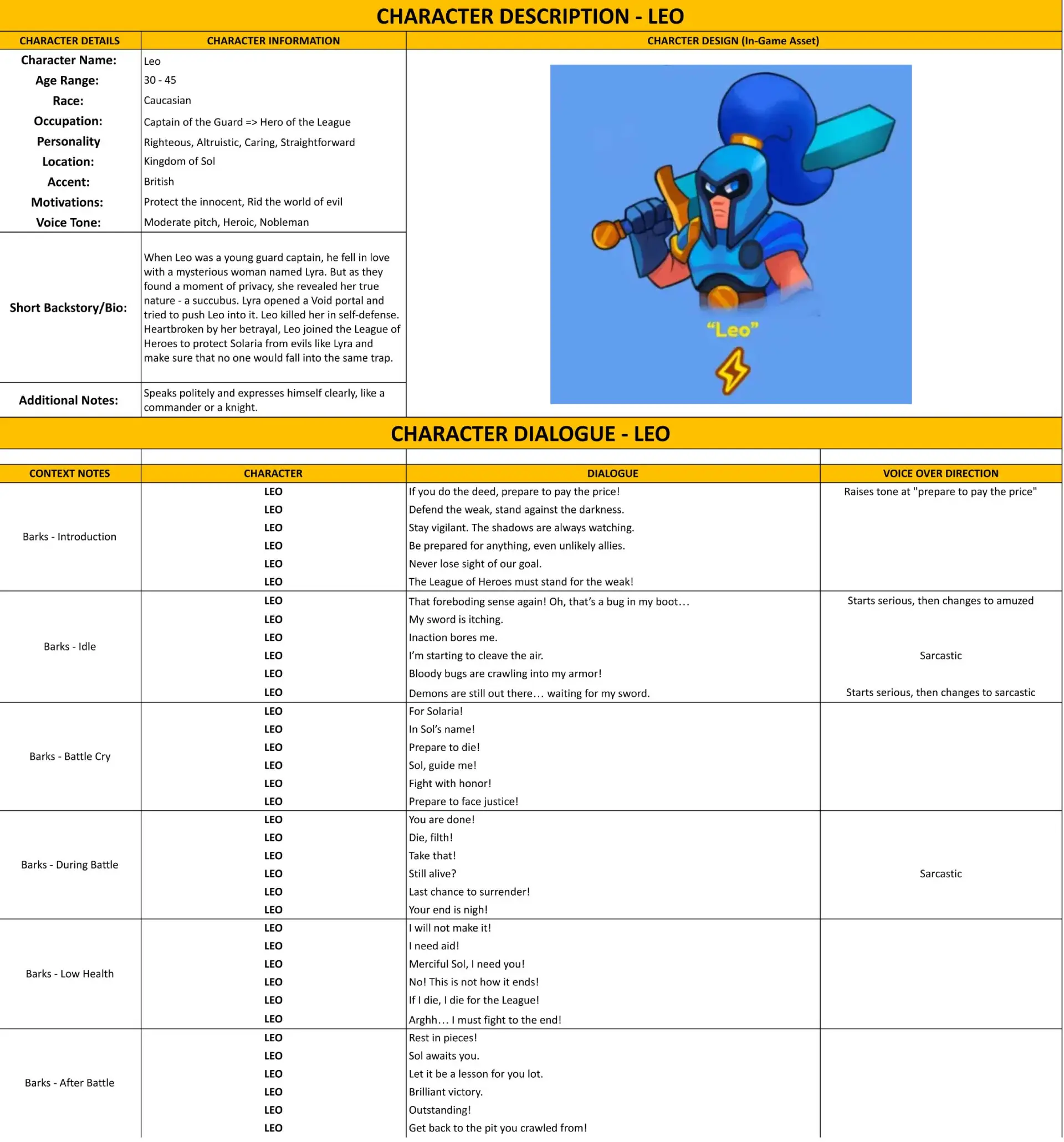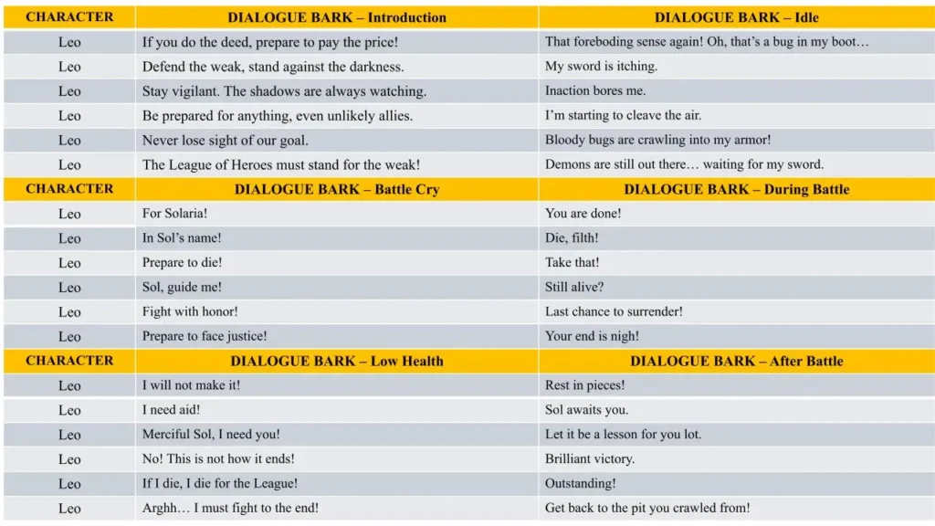 - Dialogue Lines and Barks – the character’s lines, including context, mood, and voice direction.