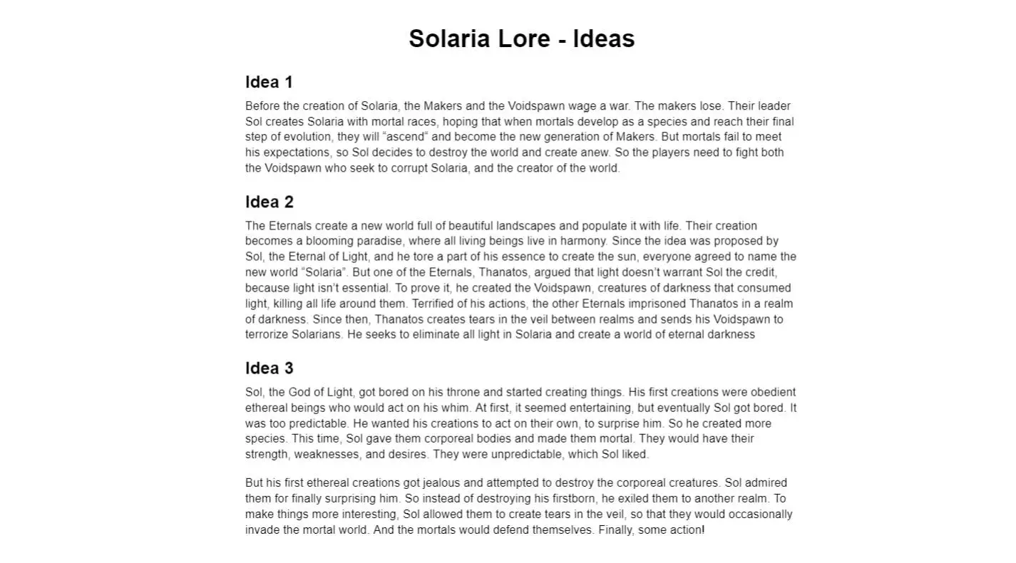 When I joined the project, Solaria had a playable demo with 2 characters and a cozy environment. They had some ideas about the game’s world, but nothing cohesive. I was assigned to develop the game’s lore.