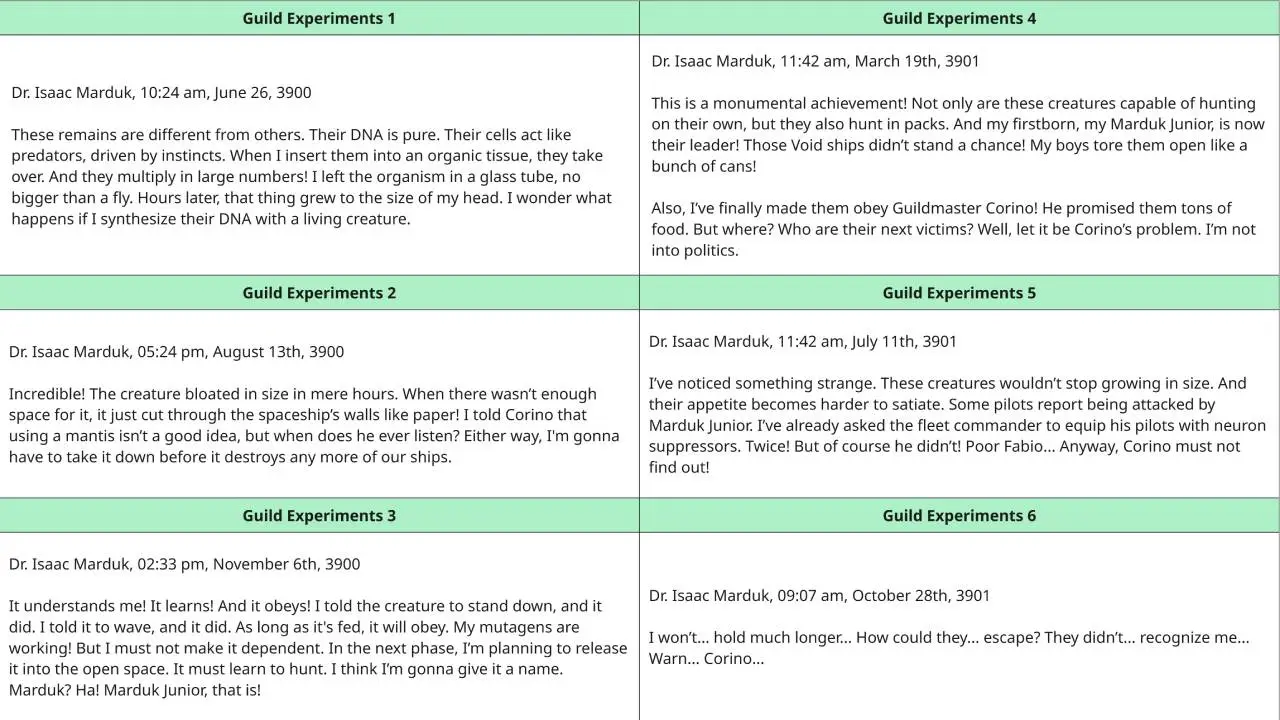 I wrote codex entries as a part of the A Strange Small Favor quest. These are the diaries of a scientist who conducted unethical experiments on behalf of the Trading Guild. These were my considerations: