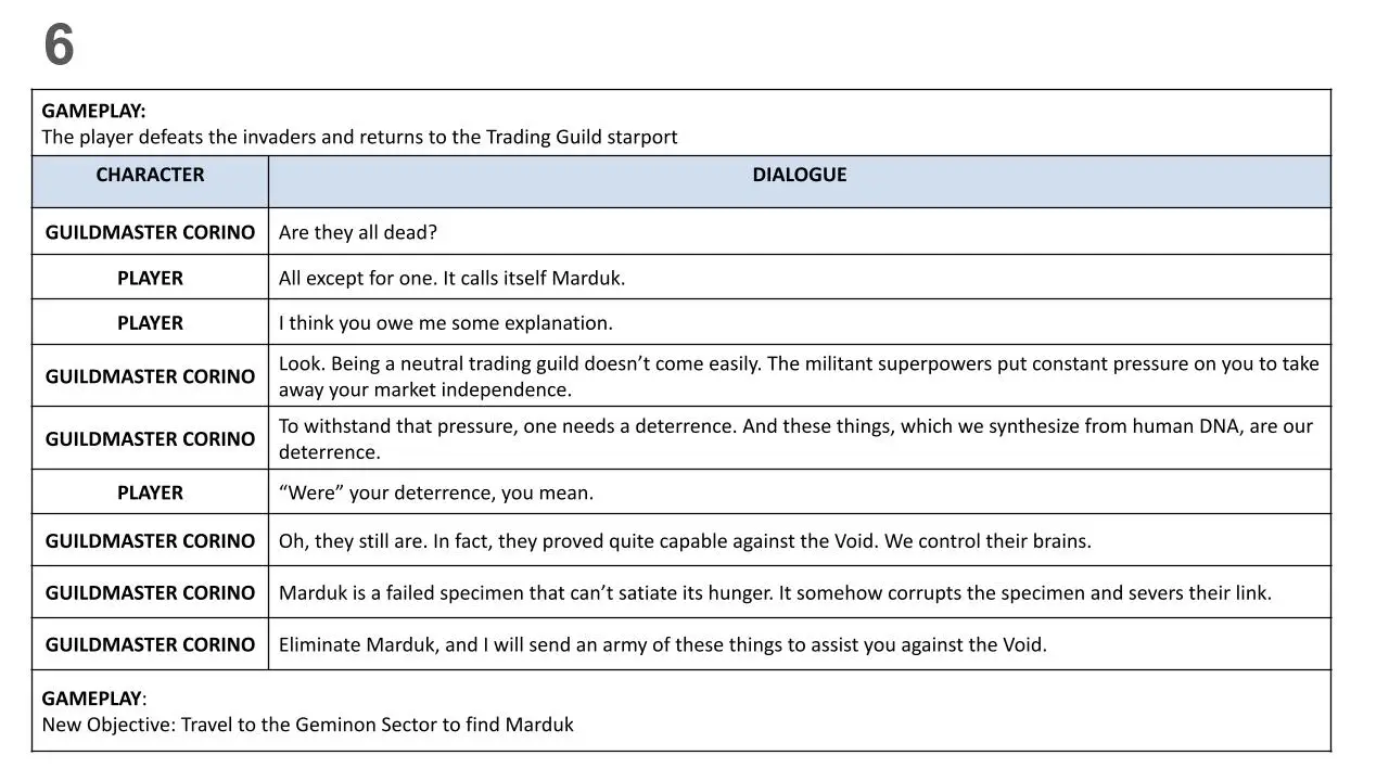 I took the quest story premise and outlined its story into story beats. Each story beat includes what the player does, how the game reacts to it, and what the player needs to do next (objectives).