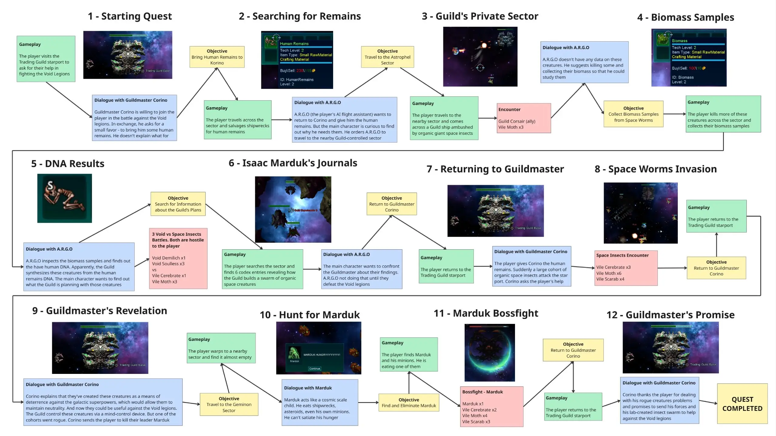 Once the outline was approved, I started the design process. My first step was to lay out the quest’s flow: